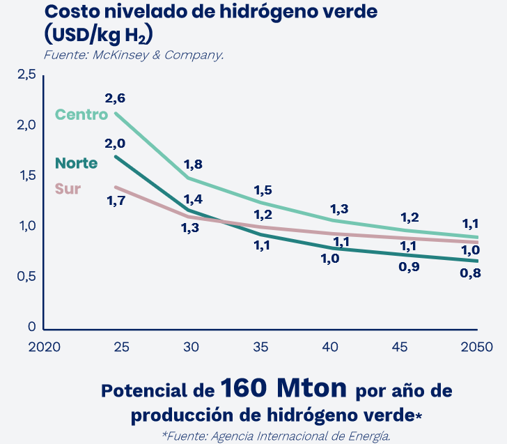El hidrógeno verde producido en el Desierto de Atacama y la Región de Magallanes, tendría el costo nivelado de producción (sin considerar compresión, transporte y distribución, los que varían según la aplicación final) más bajo del mundo al 2030.