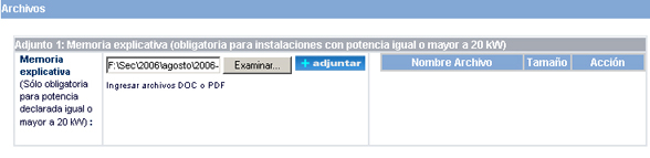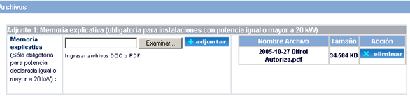 Cuando un archivo ha sido adjuntado al sistema, queda representado en una lista en donde se detallan datos del archivo, tales como nombre y tamaño, como se aprecia en la pantalla siguiente