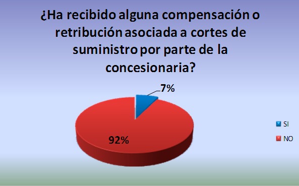 Esta vez se incorporó a la Encuesta una consulta sobre si ha recibido alguna Compensación por parte de la concesionaria, respondiendo un 92% que no, tal como se aprecia en el gráfico.