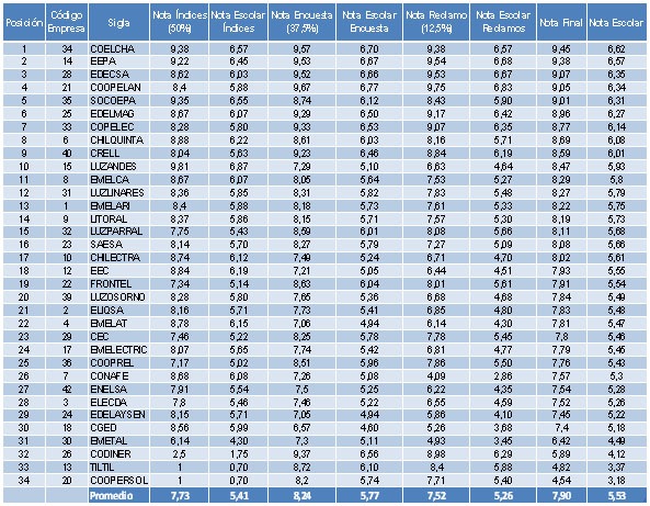 En términos generales, el Ranking 2013 muestra que las empresas obtienen una nota promedio (dentro de la escala escolar) de un 5,53, incluyendo las tres variables, siendo las empresas más destacadas COELCHA (Cooperativa Eléctrica Charrúa Limitada), con un 6,62; seguida de EEPA (Empresa Eléctrica de Puente Alto), con un 6,57; y EDECSA (Energía de Casablanca Sociedad Anónima), con un 6,35. En tanto, las que obtienen las peores calificaciones son TIL TIL (3,37) y COOPERSOL (3,18).