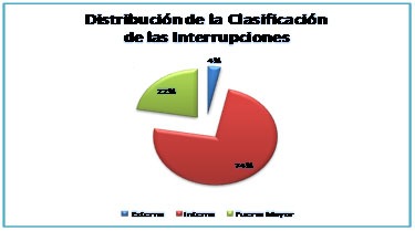 En cuanto a las causas de las interrupciones, en promedio y tal como se aprecia en el Gráfico N° 1, la mayoría de éstas es de carácter Interno (74%), es decir, son imputables a la concesionaria, porcentaje idéntico al del año pasado; un 22% son por Fuerza Mayor, por lo que no son imputables a la distribuidoras (el Ranking pasado fue 21%); y el 4% es de origen Externo, no siendo imputables pues la causa está en el sector de Transmisión o Generación (en la anterior medición el porcentaje era de 5%).