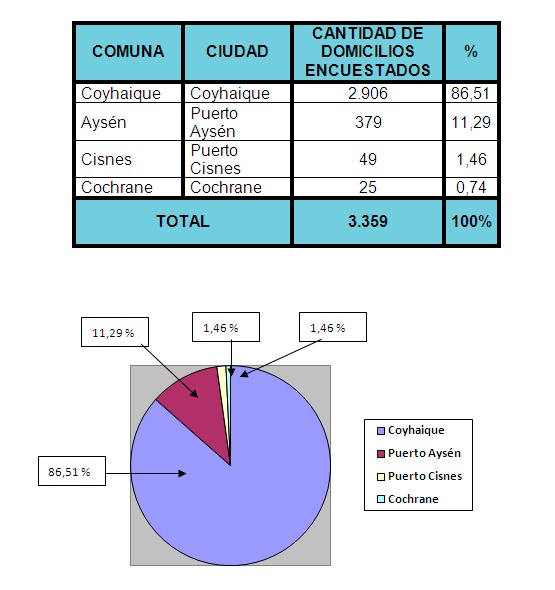 Esta encuesta fue aplicada, por personal de reparto de cilindros de las Empresas Distribuidoras de Gas Licuado Abastible S.A., Gasco GLP S.A. y Lipigas S.A., en un Universo de 3.359 domicilios de la Región de Aysén, según el siguiente desglose: