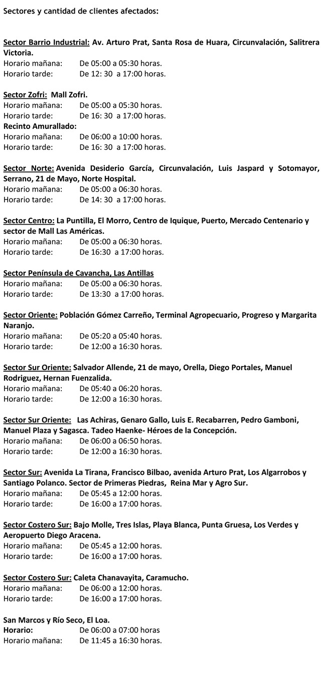 Dirección Regional de SEC Iquique instruyó a la empresa distribuidora Eliqsa adoptar las medidas necesarias para evitar que los usuarios se vean afectados por este corte programado, por un tiempo superior a las 8 horas.