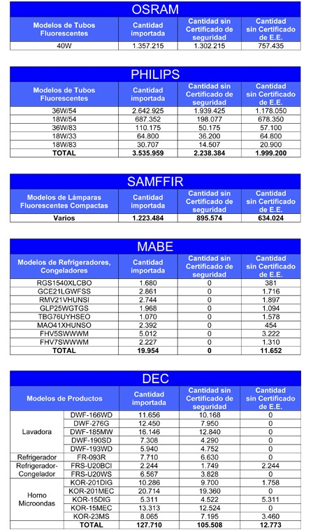 Por lo mismo, el máximo representante de la SEC indicó que, además de las multas, se ha emitido una prohibición de comercialización de las partidas no certificadas de los productos importados entre enero de 2011 y junio de 2012, que a continuación se detallan: SAMFFIR, Lámparas fluorescentes compactas; OSRAM, Tubos fluorescentes; DEC, Lavadoras, refrigeradores-congeladores y microondas; PHILIPS, Tubos fluorescentes; y MABE, Refrigeradores-congeladores. El listado completo con los modelos afectados se encuentra en www.sec.cl.