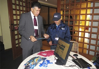 El Superintendente de la SEC, Luis Ávila Bravo, revisa junto al Fiscalizador de SEC Valparaíso, Jorge Retamal Abarzúa, el material informativo que se entregó tras el Seminario realizado en Viña del Mar. El máximo representante del organismo fiscalizador destacó la importancia de este tipo de encuentros entre el sector público y el privado.